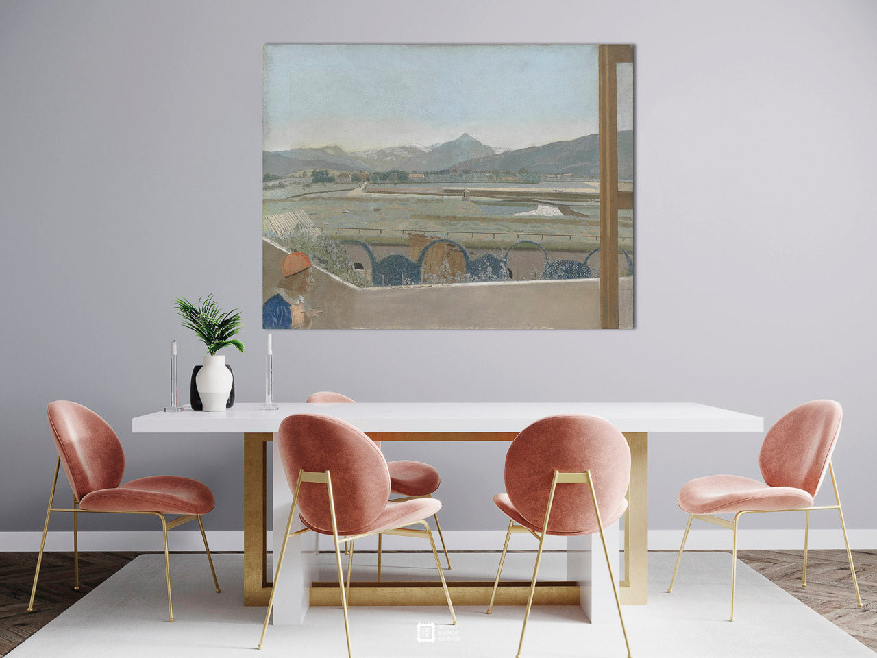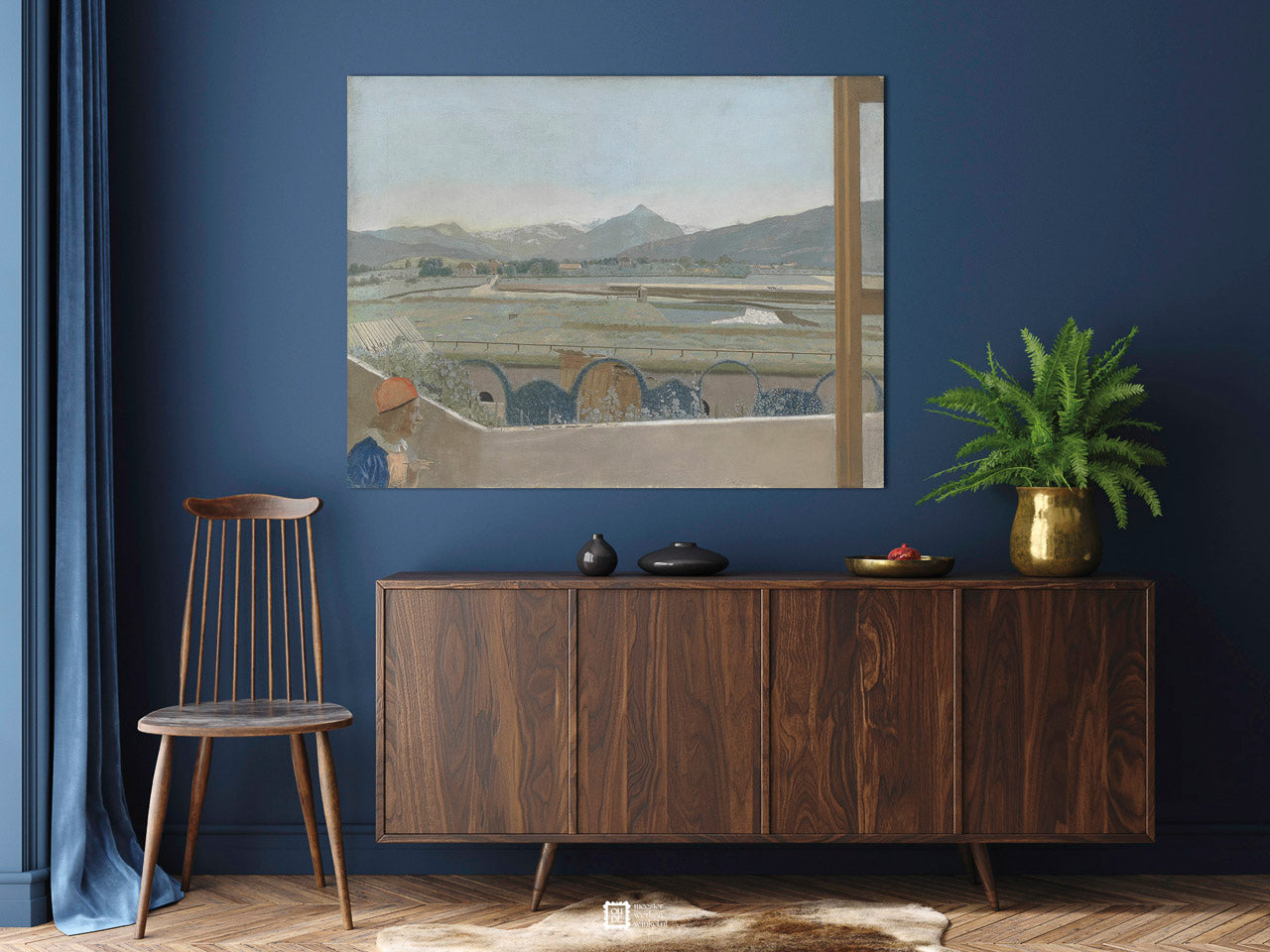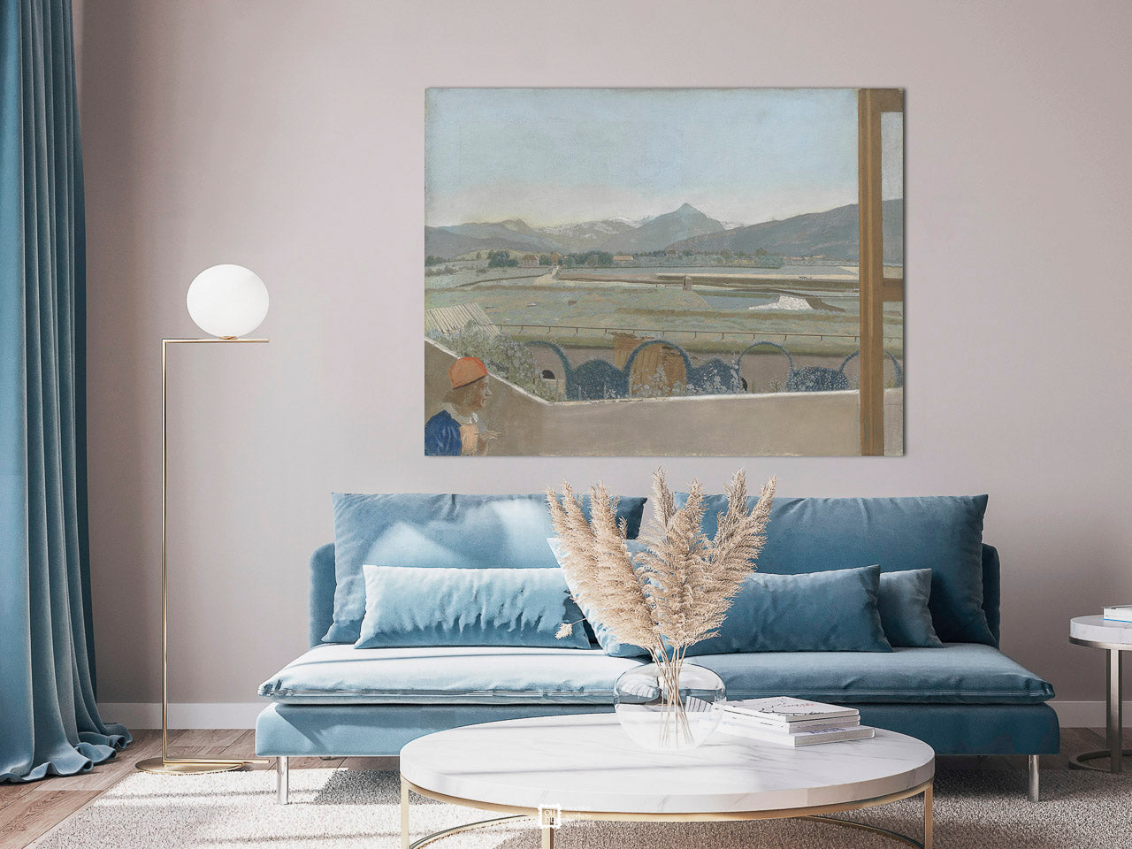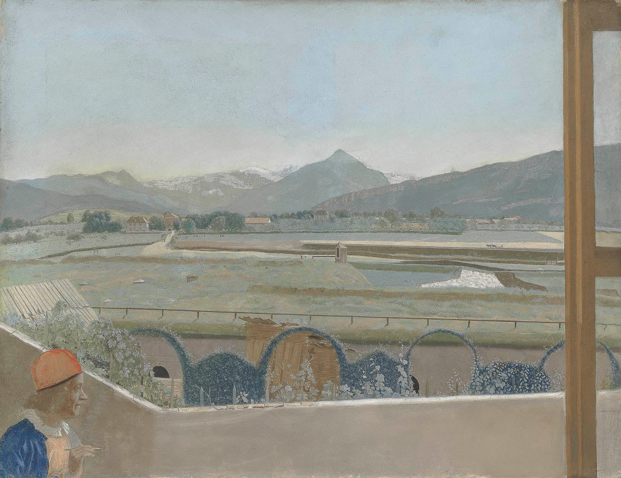 Gezicht op het Mont Blanc-massief vanuit het atelier van de kunstschilder te Genève met zelfportret