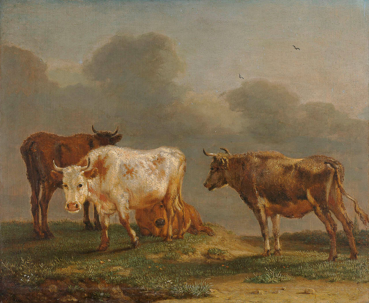 Vier jonge stieren in de wei